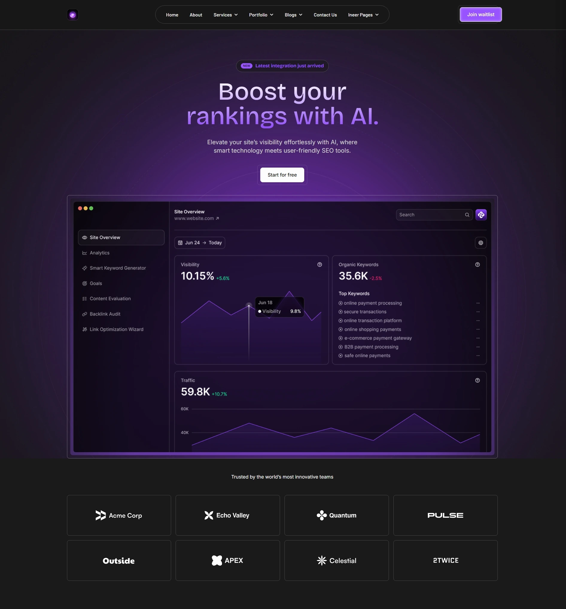 AI-powered SEO SaaS landing page using WordPress + Elementor Pro + WooCommerce. Features keyword generator, one-click optimization, competitor reports, and pricing plans. 95+ performance score with SaaS-optimized conversions.