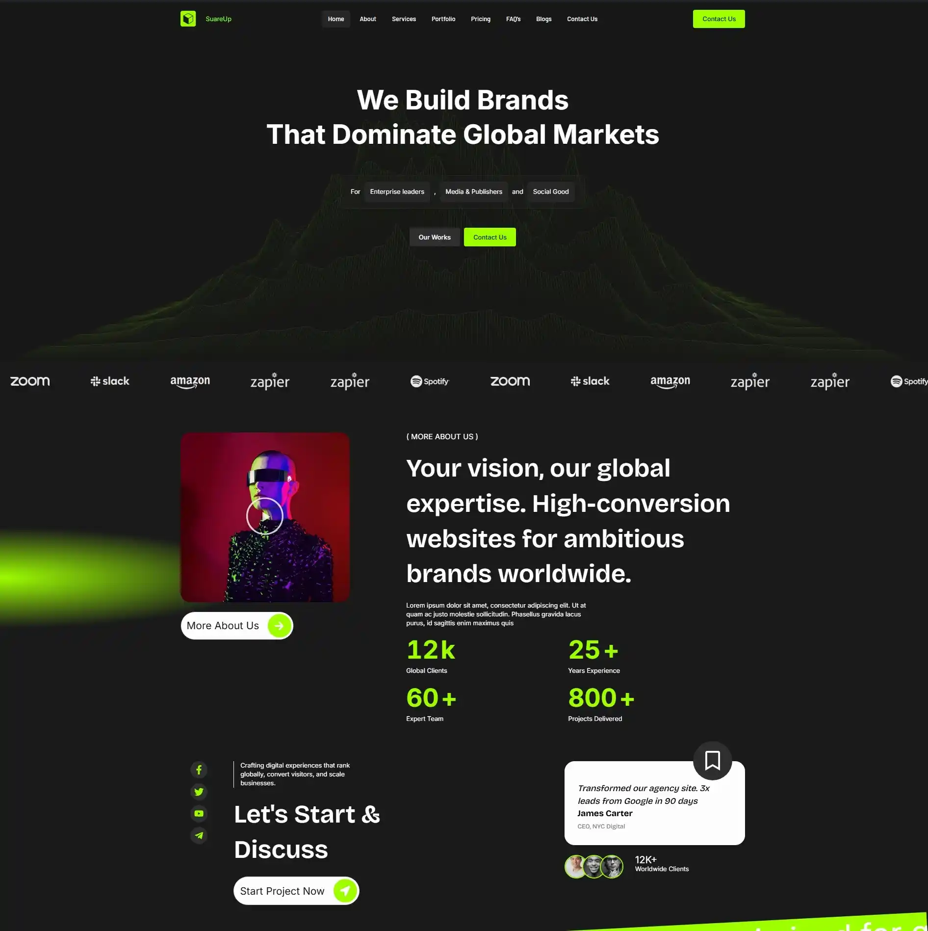 Digital marketing agency for Saudi Arabia. Bilingual WordPress + Elementor site with services (content creation, ad campaigns, SEO), portfolio, blog, WhatsApp integration. 1.5K+ clients, +70% sales growth. 95+ performance score optimized for KSA market.